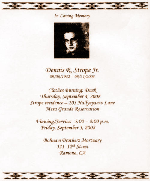 Obituary of Dennis R. Strope Jr., Mesa Grande Indian Reservation, Clothes burning ceremony, Viewing/Funeral Services.